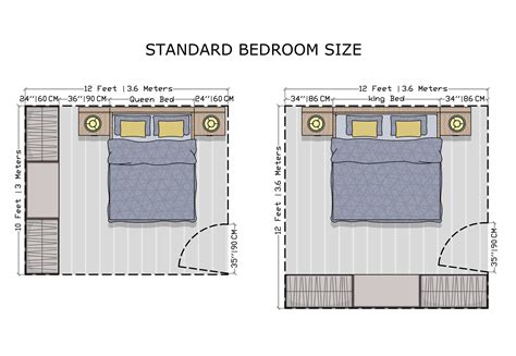 On this page you'll find bedroom size info showing bedroom dimensions and bedroom layouts for each bed. The average size of a master bedroom was much larger, measuring 14 feet by 16 feet. A standard bedroom usually measures 10ft by 12ft, providing 120 square feet of space. States is 70 sq ft.